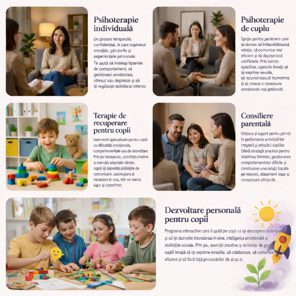 TARIFE: DESCRIERE SERVICII În curând pentru copii! Ateliere de dezvoltare personală prin teatru Ateliere de pictură Ateliere de lectură și povești terapeutice Ateliere de creație ÎNCEPEM ÎNSCRIERILE. LISTELE SUNT DESCHISE!